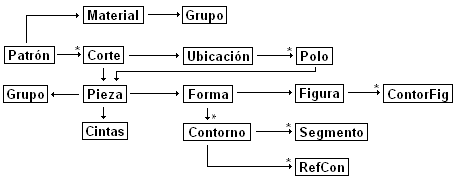 que contiene 4 niveles de profundidad por las relaciones master-detalle Patrón.Corte, Ubicación.Polo, Forma.Contorno y Contorno.Segmento.